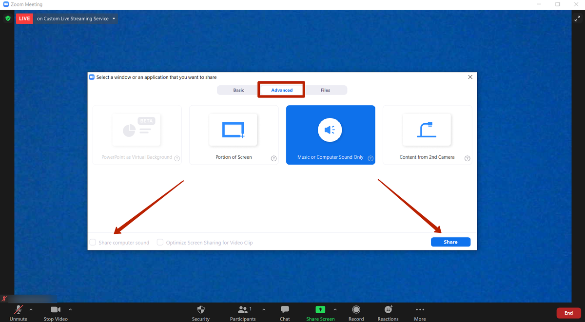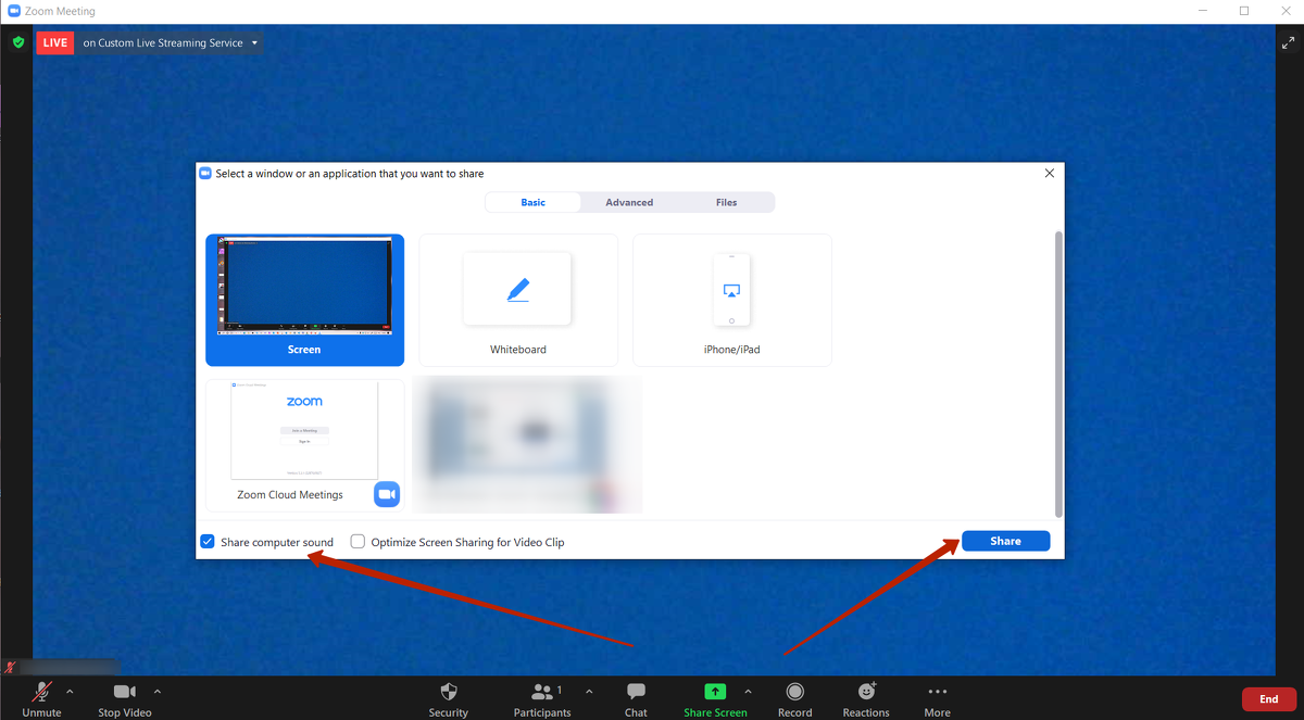 Se quiser transmitir som junto com a tela (por exemplo, em um vídeo), marque a caixa de seleção "Compartilhar som do computador".