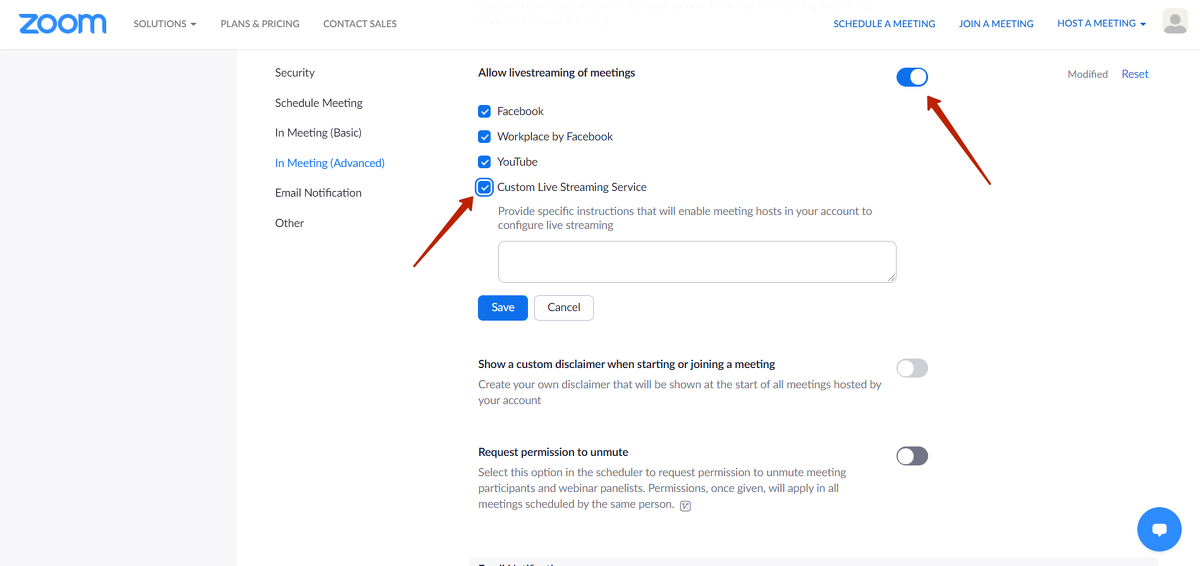 Defina a configuração do streaming para a conferência criada em seu perfil pessoal do ZOOM.
