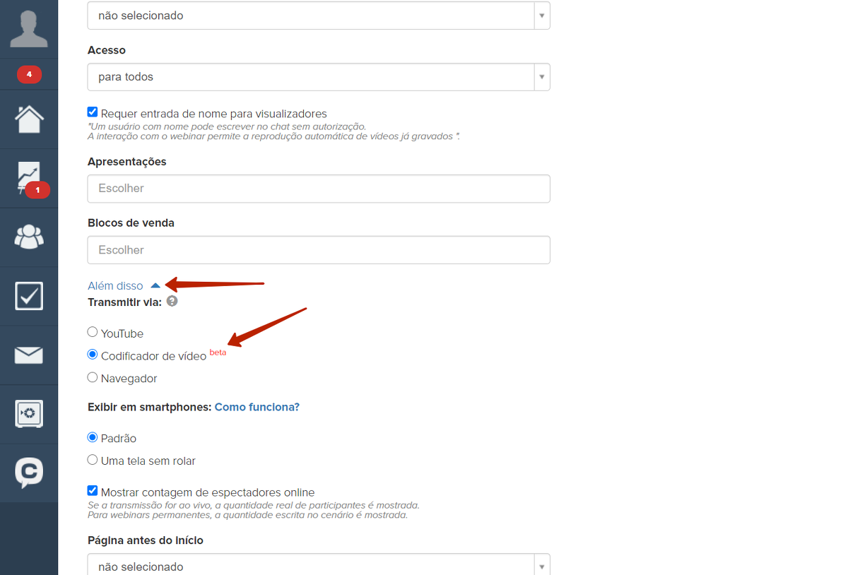 Se deseja transmitir sua conferência diretamente para uma sala de webinar no GetCourse, crie um webinar em sua conta GetCourse. Nas configurações avançadas do webinar, defina o tipo de emissão "Codificador de vídeo".