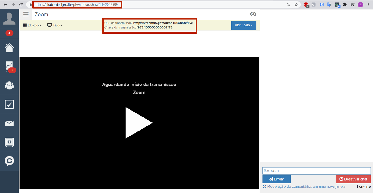 Na sala de webinar no GetCourse, copie o URL, a chave de transmissão e o link para a sala.