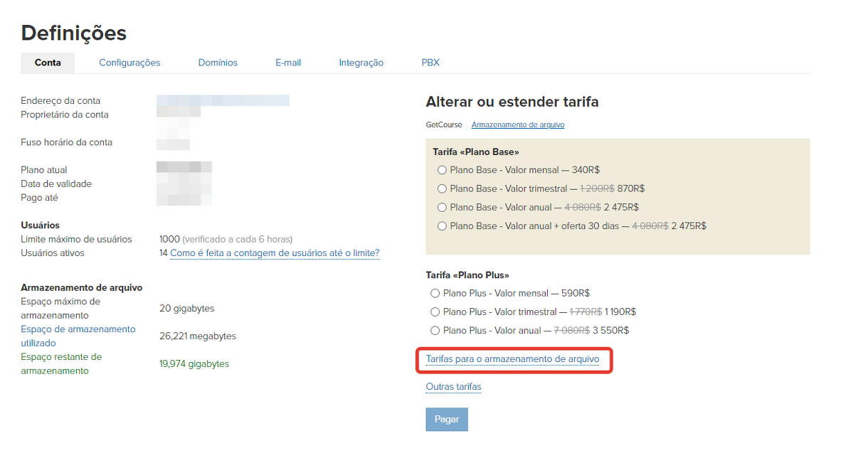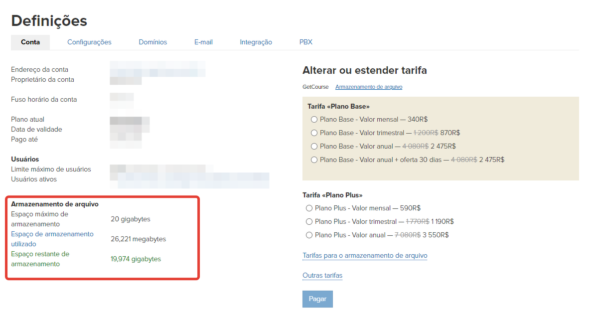 Se você precisar aumentar o tamanho do espaço de armazenamento de arquivos de sua conta GetCourse para uma quantidade fornecida pelas taxas de expansão padrão (10 GB, 50 GB, 100 GB, 200 GB, 500 GB), será necessário criar um pedido a partir de sua conta para a quantidade e período correspondentes.