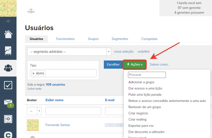 Também é possível realizar uma determinada ação com vários usuários ao mesmo tempo. Para isso, faça a seleção de usuários desejada e clique em "Ações":