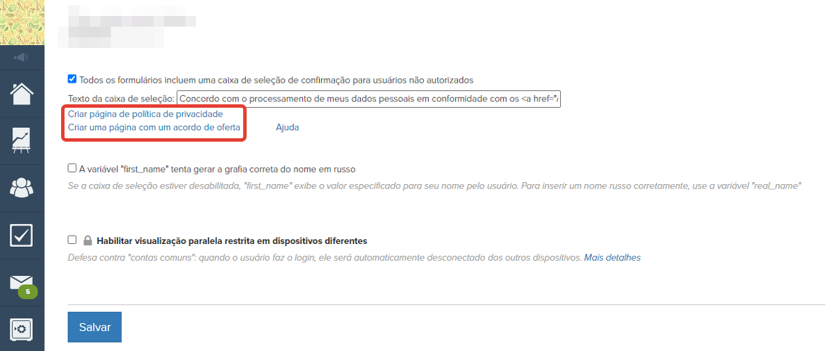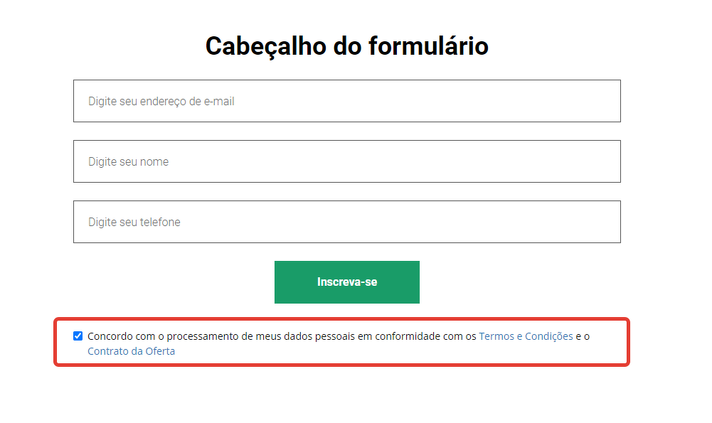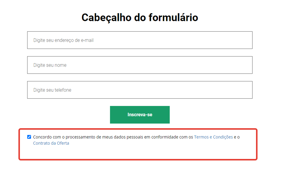 Uma caixa de verificação para confirmar o consentimento às condições será habilitada em todos os formulários de conta criados no GetCourse e em widgets. Ela será exibida apenas para usuários não logados. Se o usuário estiver logado na conta, a caixa de verificação de confirmação ficará oculta.