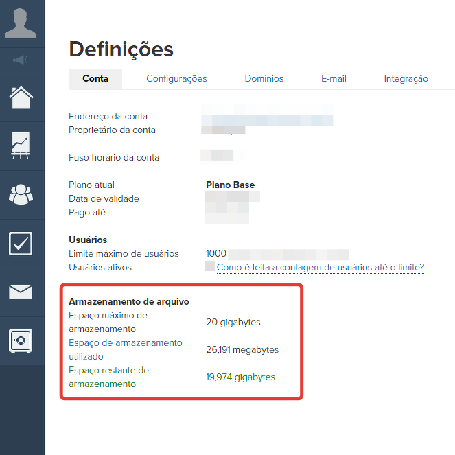 Para ver o espaço disponível e utilizado no armazenamento de arquivos, vá em "Perfil" → "Configurações da conta" → aba "Conta":