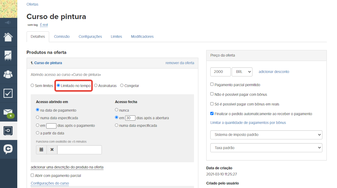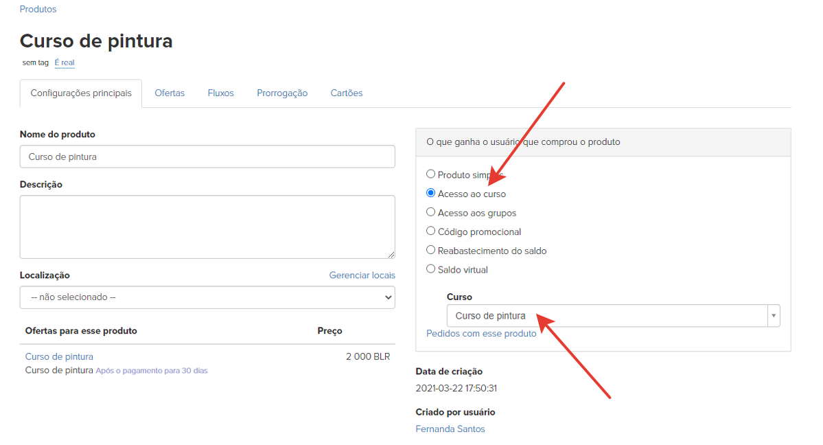 Após clicar no botão "Salvar e criar uma página para venda", uma página será criada automaticamente, um Produto com acesso a este treinamento e uma Oferta com o valor e período de acesso especificados, se estiver definido.