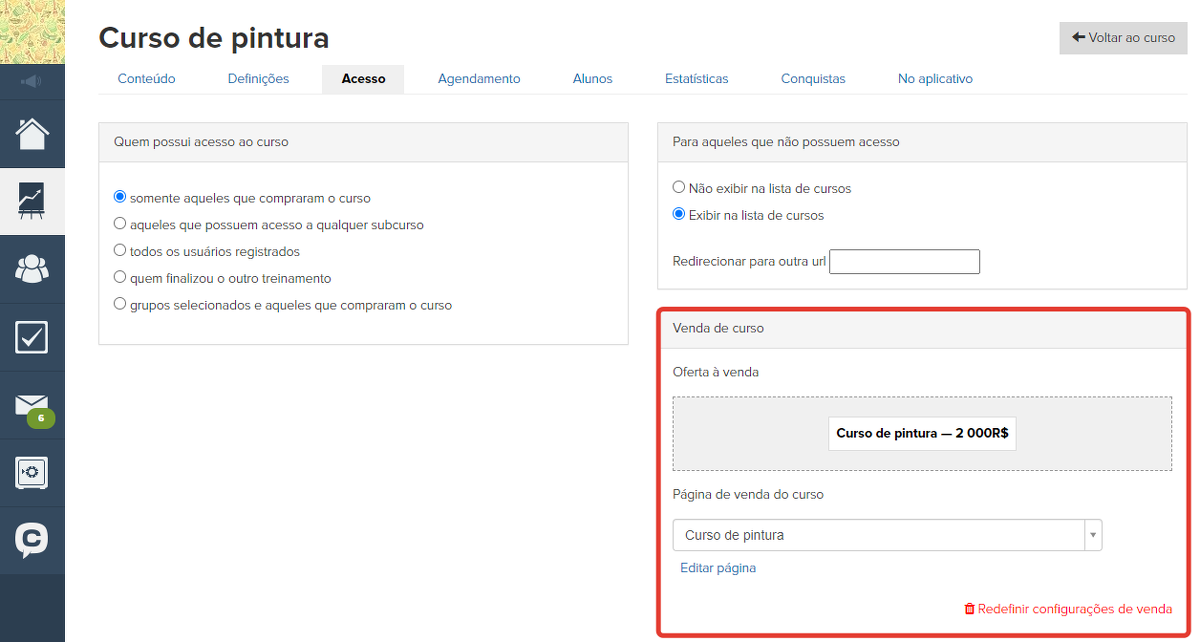 Em seguida, um bloco com a oferta de venda e um link para a página de venda aparece nas configurações do treinamento no bloco "Venda do treinamento".