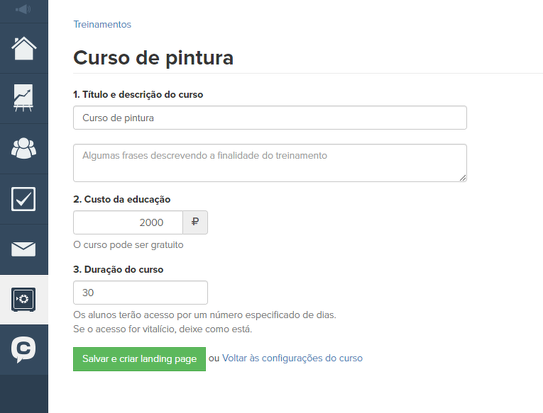 Será aberta uma página onde você pode definir o nome do treinamento e sua descrição, assim como o valor e a duração do treinamento. A duração deve ser indicada se o acesso ao treinamento for concedido por um determinado número de dias. Deixe esse campo em branco para manter o acesso permanente após a compra.