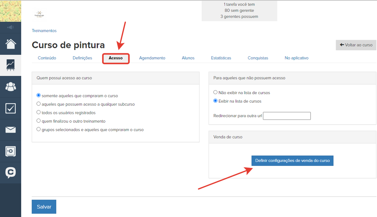 Para isso, vá até a seção "Acesso" nas configurações do treinamento e clique no botão "Definir parâmetros de venda do treinamento".