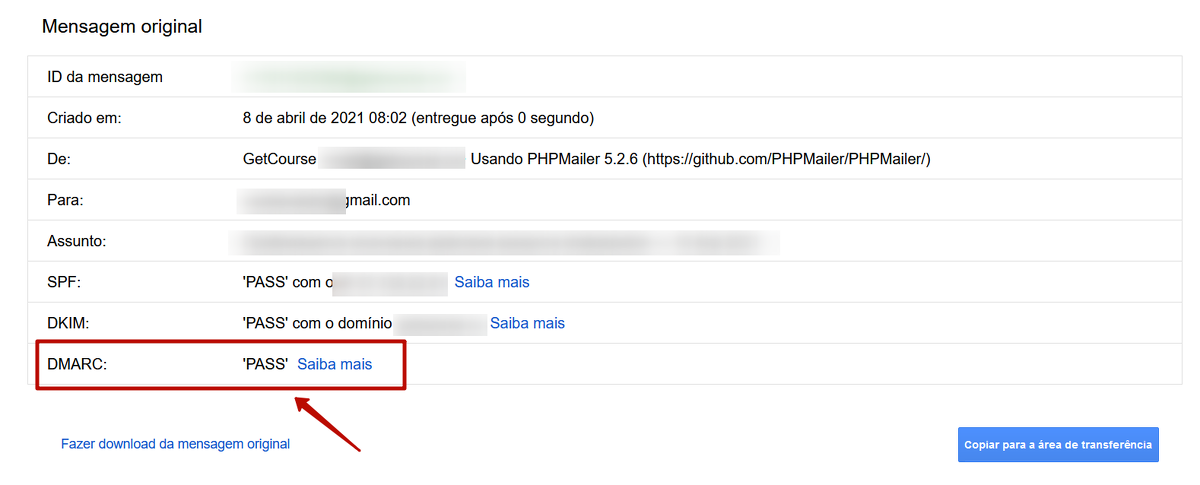 É possível ver se determinada mensagem passou na verificação DMARC nos cabeçalhos técnicos deste e-mail: