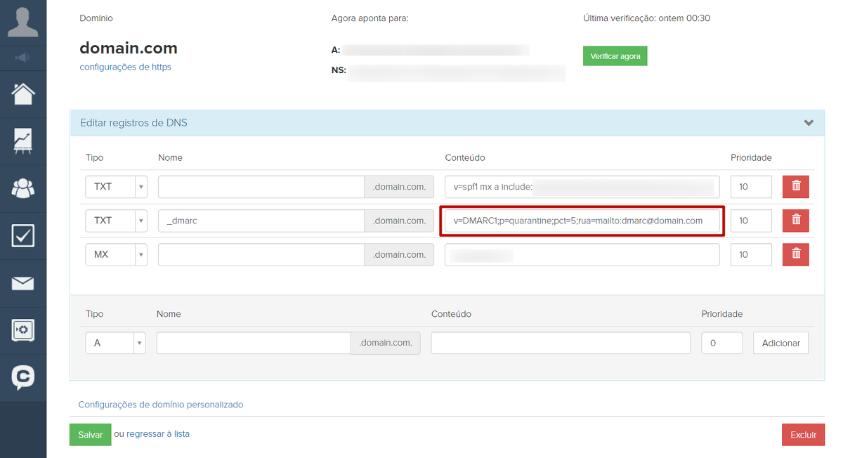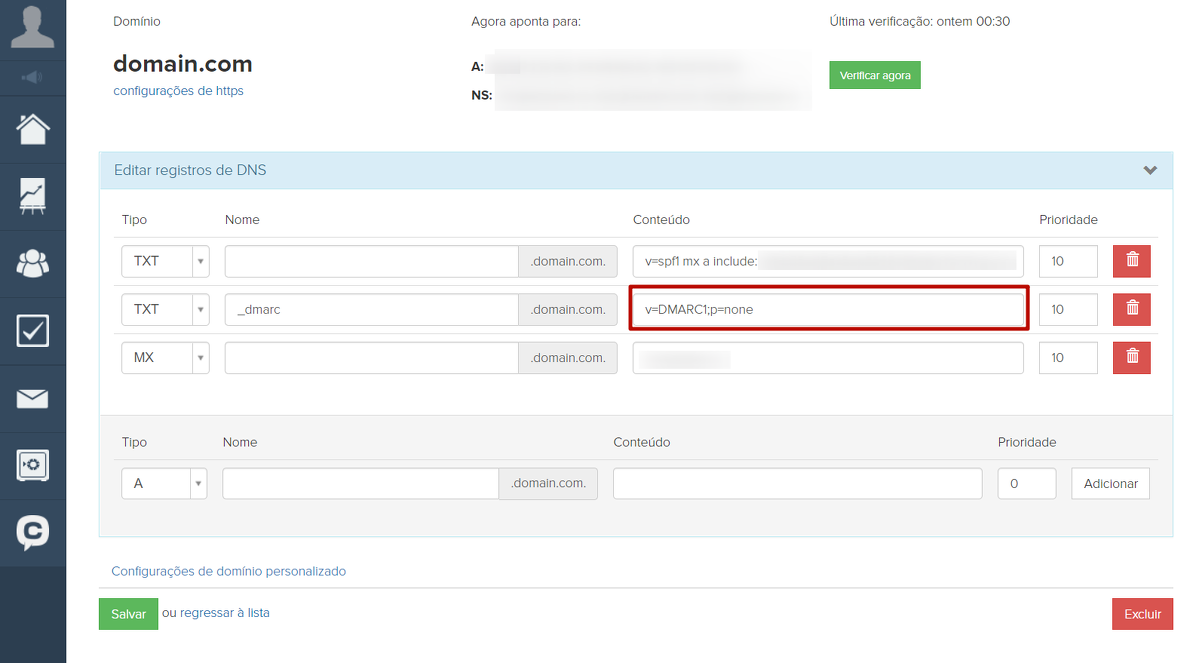 Alguns serviços de e-mail prestam atenção especial à configuração DMARC. No entanto, essa é apenas uma recomendação. A ausência de um registro DMARC ou de uma política none não afeta a capacidade de entrega de seus e-mails de forma alguma. Portanto, você pode deixar um registro padrão nas configurações de seu domínio com o seguinte valor: v=DMARC1; p=none