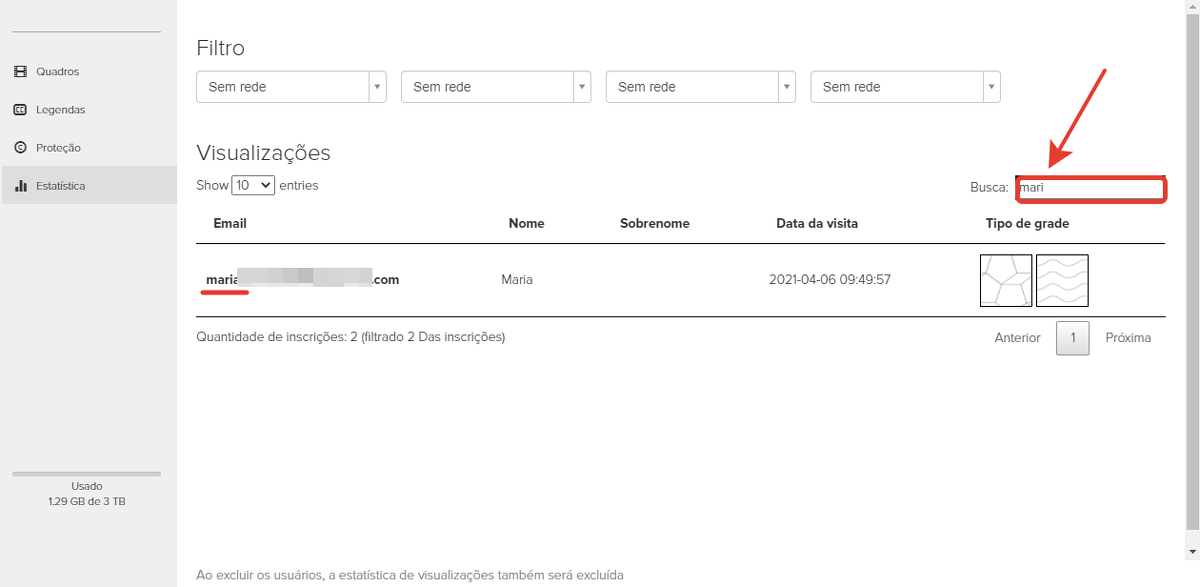No campo de pesquisa, é possível indicar parcial ou totalmente o endereço de e-mail, nome de usuário ou a data da visualização pretendida para acessar rapidamente as informações de seu interesse.