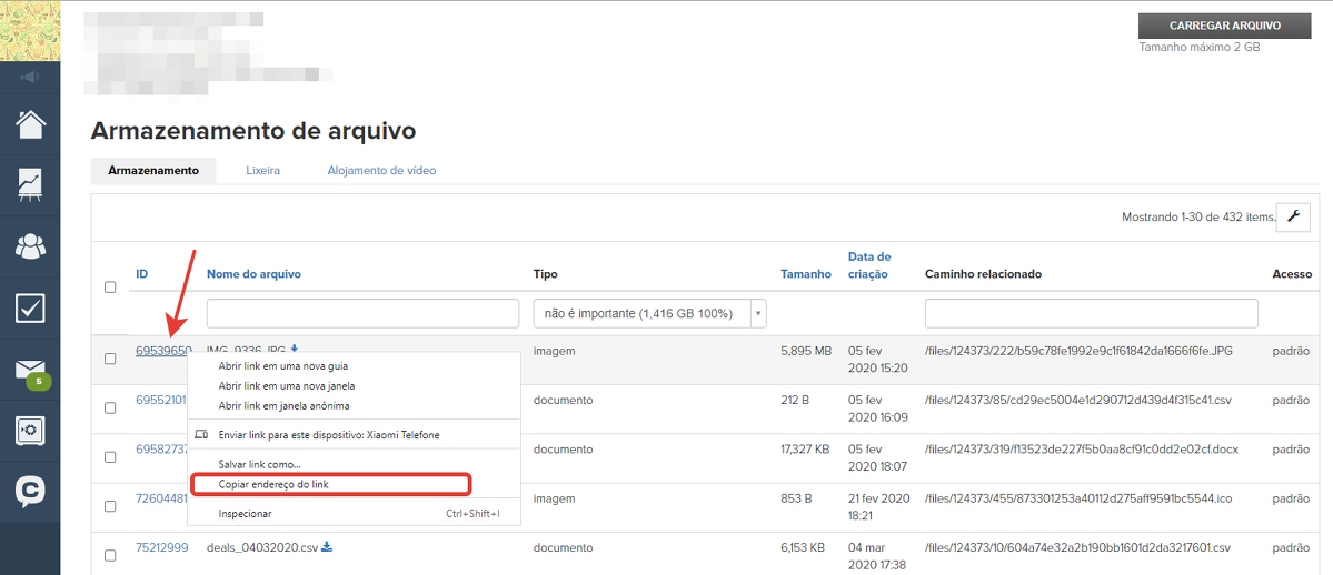 Em seguida, é possível distribuir esse arquivo usando um link. Para isso, vá para o armazenamento de arquivos, clique com o botão direito no arquivo desejado e selecione "Copiar endereço do link".