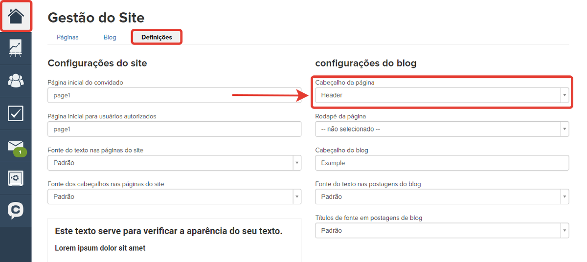 Para criar um cabeçalho comum a todas as páginas do blog, vá na aba "Configurações" na seção "Site" e especifique o cabeçalho da página nas “Configurações do blog”: