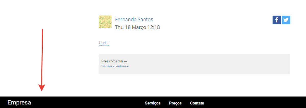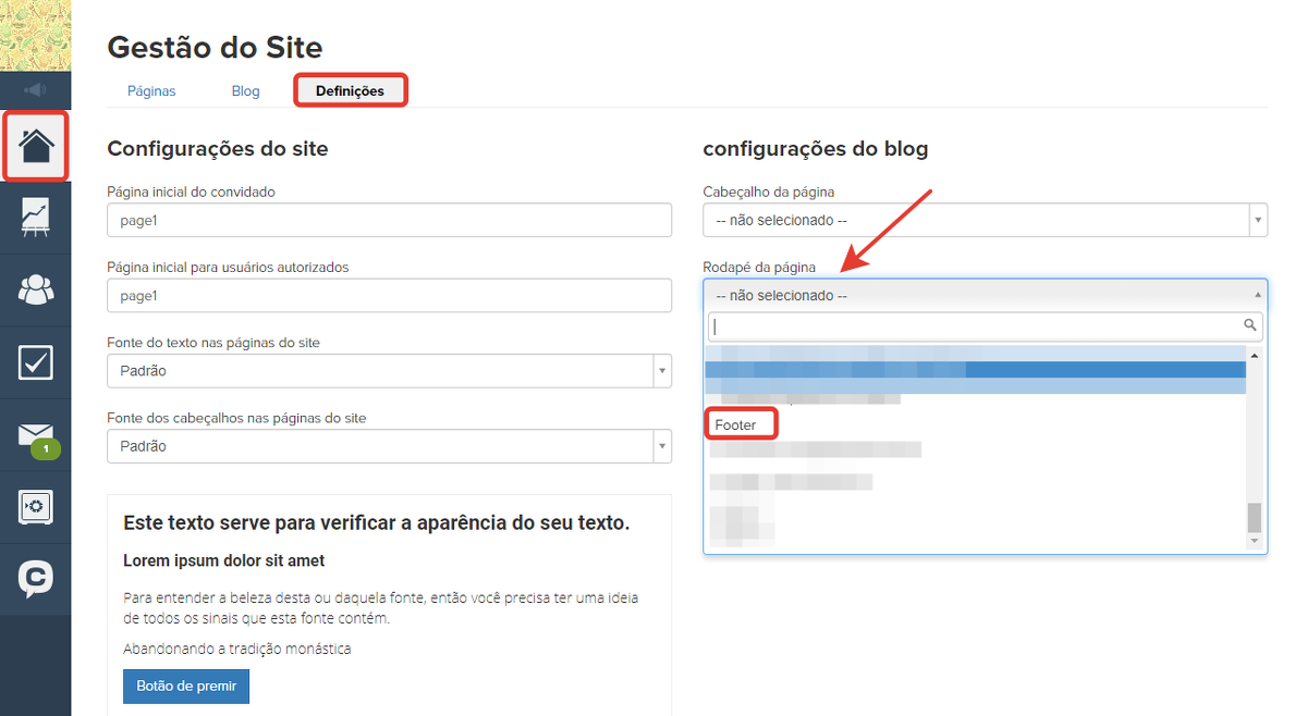 Para criar um rodapé comum para as páginas do blog, vá na aba "Configurações" na seção "Site" e especifique o rodapé da página nas “Configurações do Blog”: