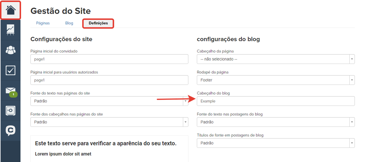 Para definir um título para o blog, abra a aba “Configurações” no menu “Site” e escreva o título na seção “Configurações do blog” - “Título do blog”.