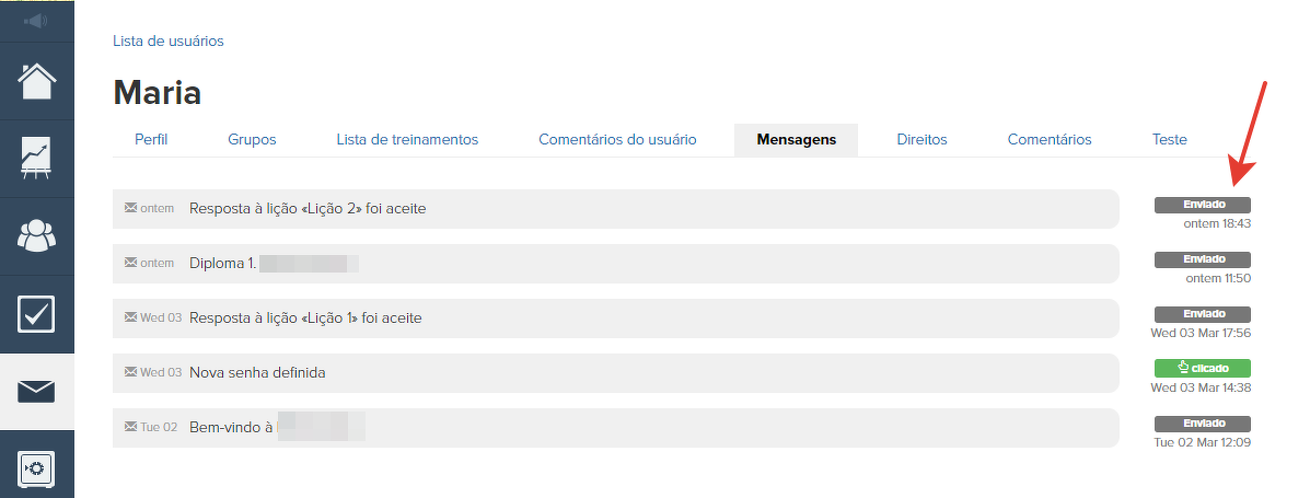 Em seguida, verifique o status da mensagem no GetCourse, indo, por exemplo, na seção "E-mails" no perfil do usuário. Talvez o status ao lado da mensagem indique