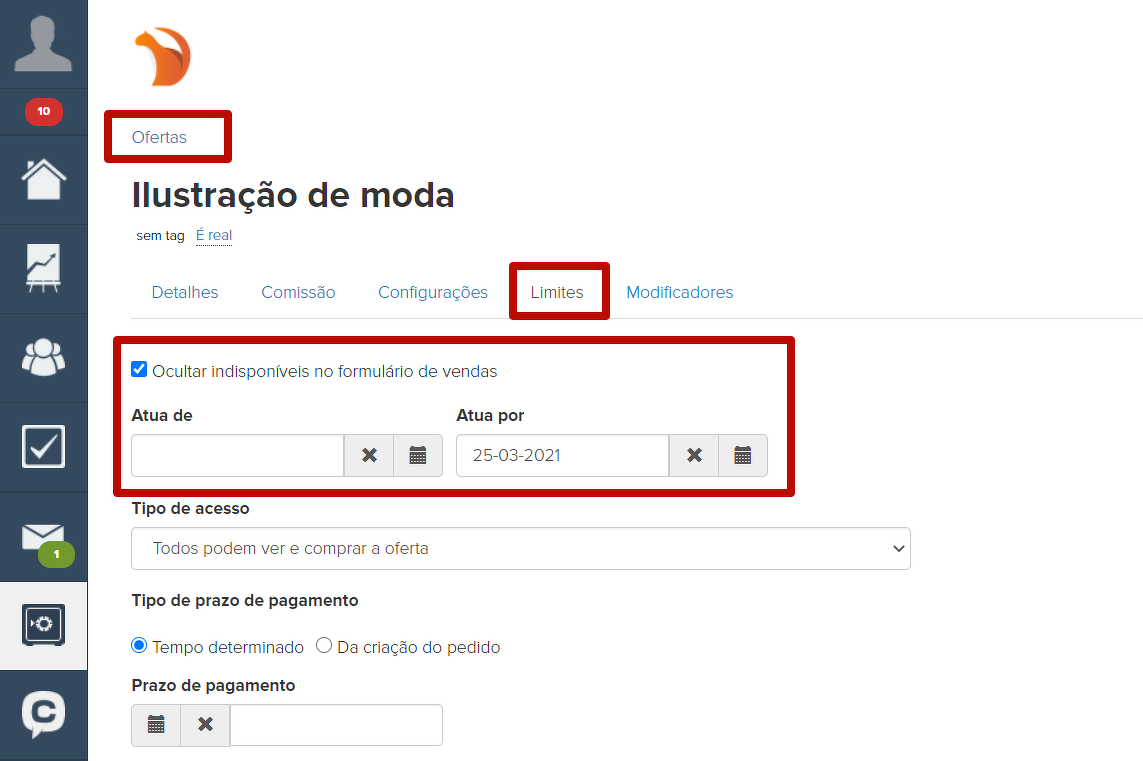 Isso é feito nas configurações da oferta, na aba "Restrições". É necessário especificar as datas de expiração e marcar a caixa "Ocultar ofertas indisponíveis no formulário de venda"