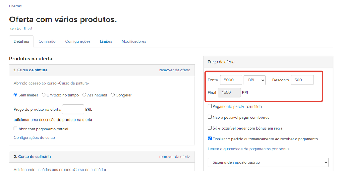 Se o cliente quiser adquirir essa oferta, mas já tiver adquirido alguns dos produtos nela contidos, é possível deduzir automaticamente o valor do novo pedido, tendo como base o pagamento anterior.