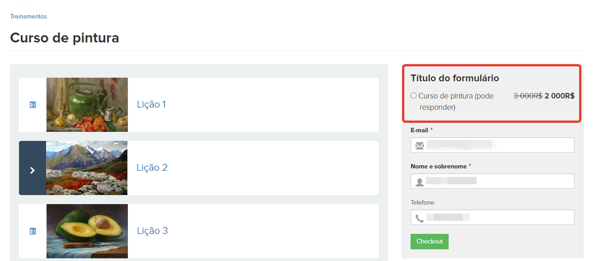 O usuário adquiriu anteriormente um curso de pintura ao valor fixo de 800 $