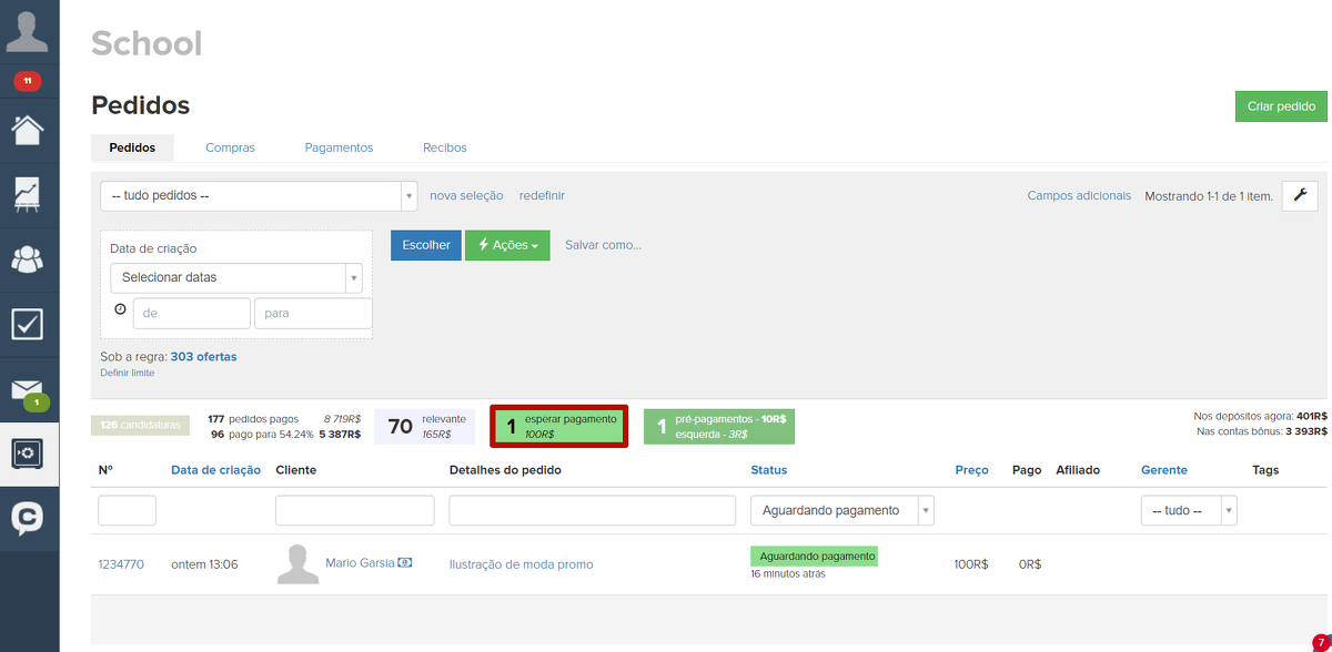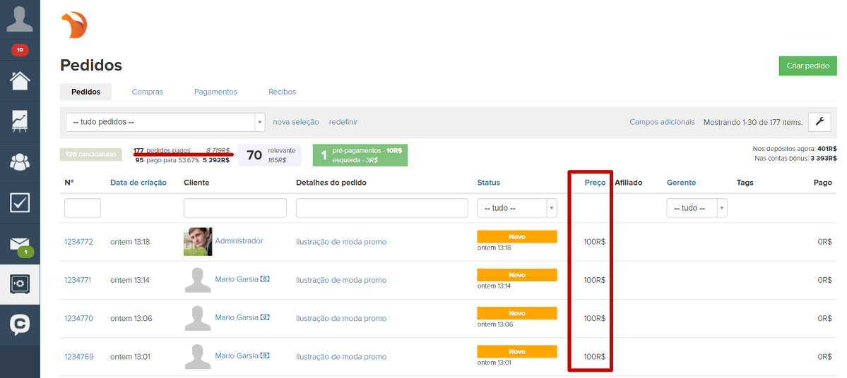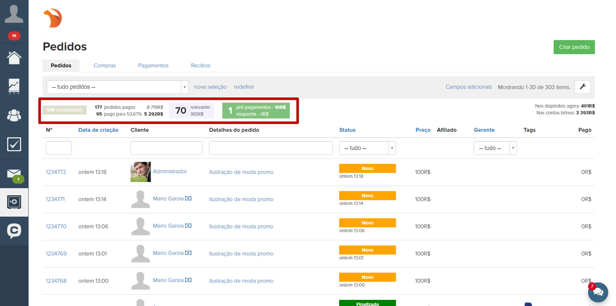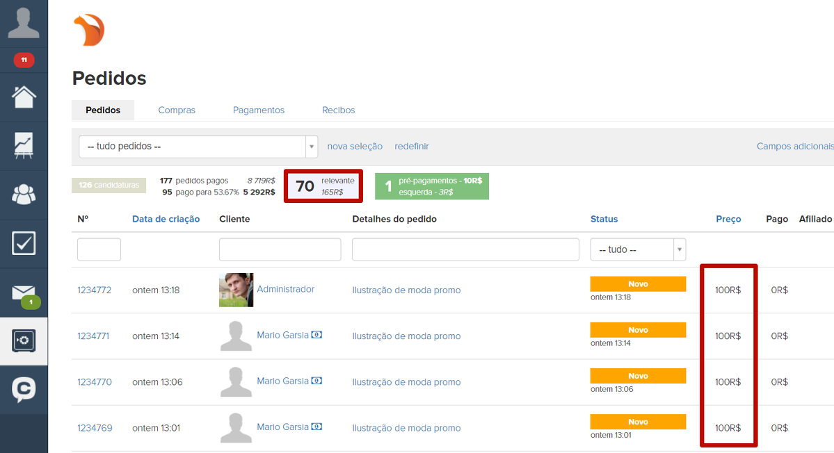 4. Pedidos efetuados. Essa seção especifica o número de pedidos para os quais espera-se o pagamento do usuário. A lista gerada ao clicar em um elemento conterá os pedidos com o status “Novo”, “Em andamento”, “Não confirmado”, “Aguardando pagamento”, “Parcialmente pago”, “Aguardando devolução” e “Adiado”.