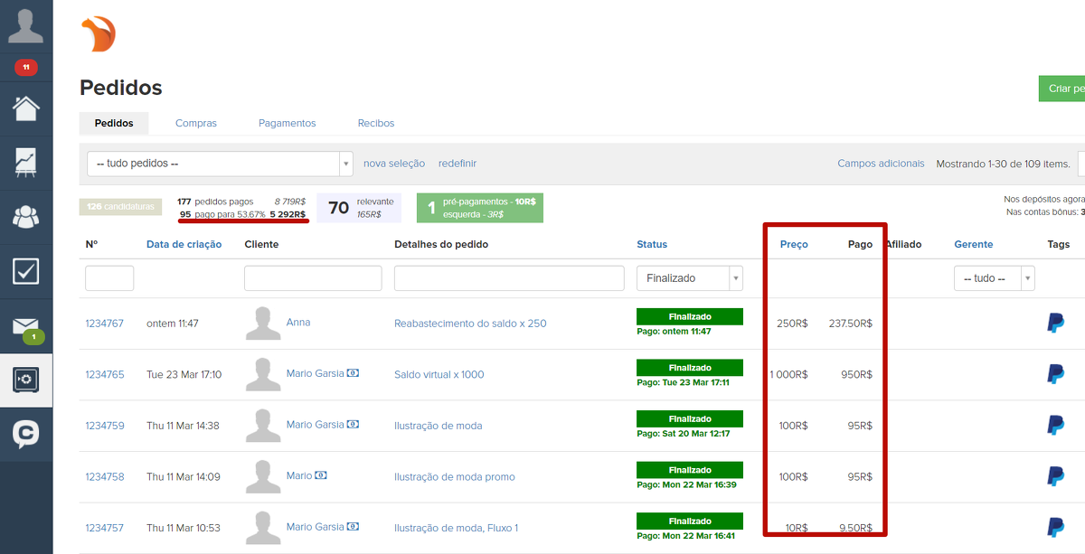 2. Pedidos pagos. Essa seção exibe o número de pedidos realizados para ofertas pagas, bem como o valor total dos pedidos. A lista gerada ao clicar em um elemento conterá os pedidos em qualquer status (pago, parcialmente pago, cancelado, finalizado, etc.), exceto no status “Falso”.