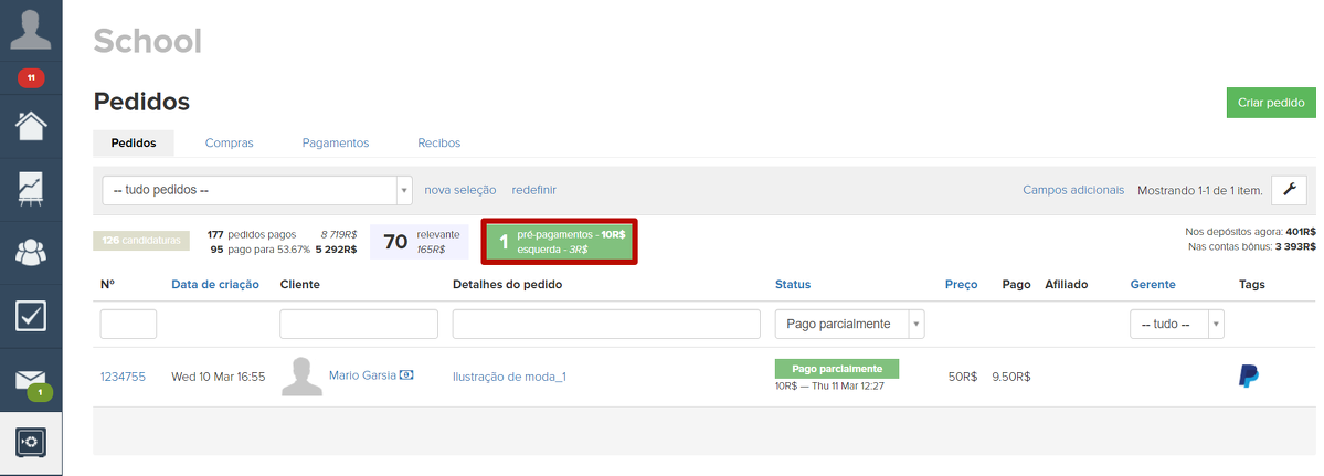 6. Pré-pagamentos. Essa seção indica o número de ordens pagas emitidas para ofertas pagas, para as quais foi realizado um pagamento parcial. O valor inclui o montante dos pagamentos efetuados, bem como o valor que falta pagar para todas as encomendas parcialmente pagas. A lista gerada ao clicar em um elemento também conterá apenas os pedidos com o status "Parcialmente pago".