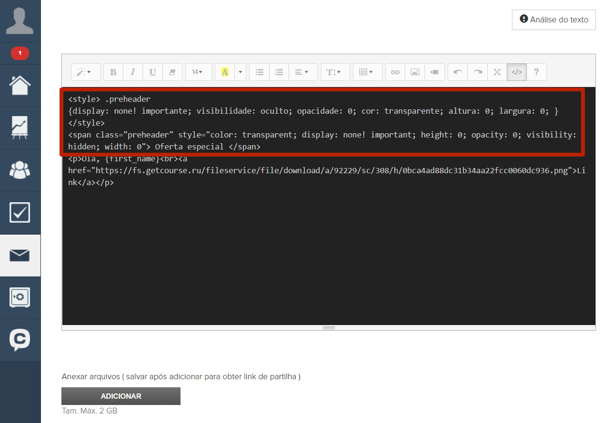 No início do e-mail, acrescente o seguinte código: