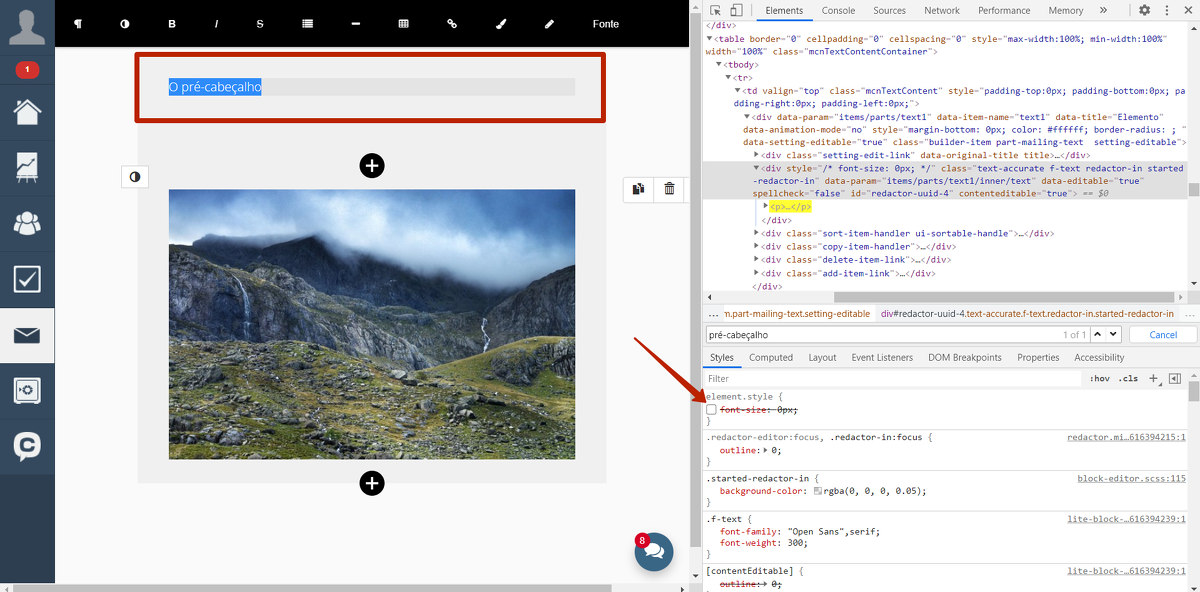 "font-size: 0px". Como resultado, o bloco de texto com um título preliminar se tornará visível e editável novamente.