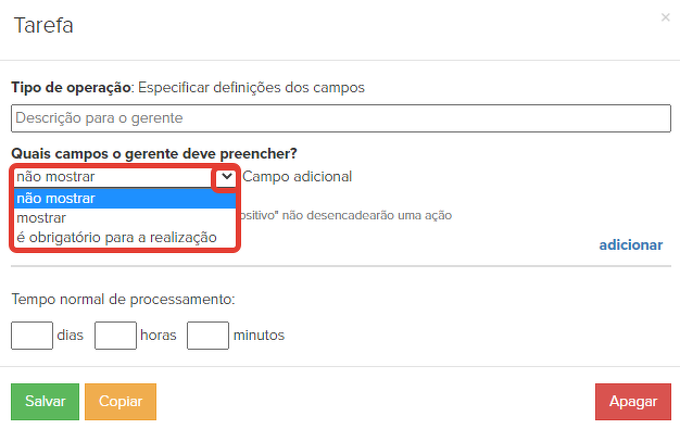 - Ao escolher a opção "Preenchimento obrigatório", o gerente verá o campo e será obrigado a preenchê-lo para concluir a tarefa.