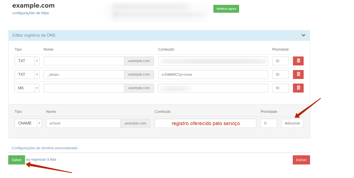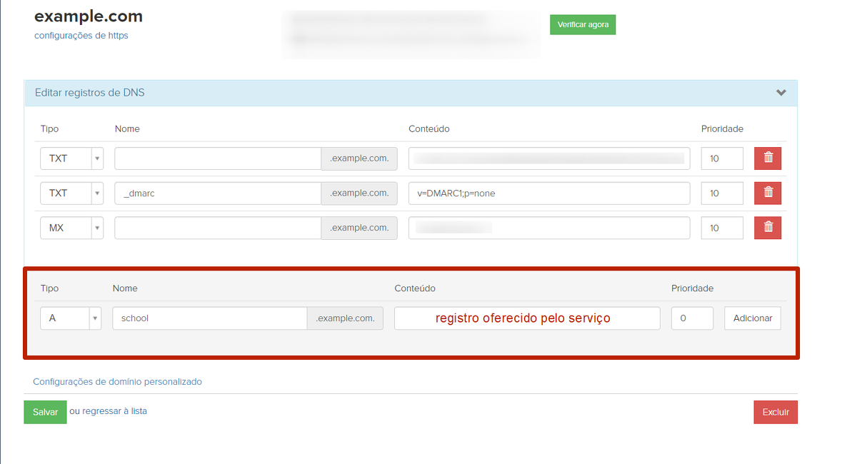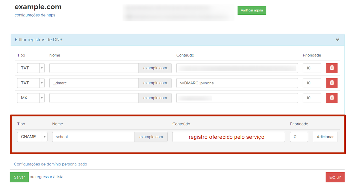 Para esse tipo de vinculação, é necessário especificar no lado do serviço qual registro CNAME deve ser registrado na zona DNS.
