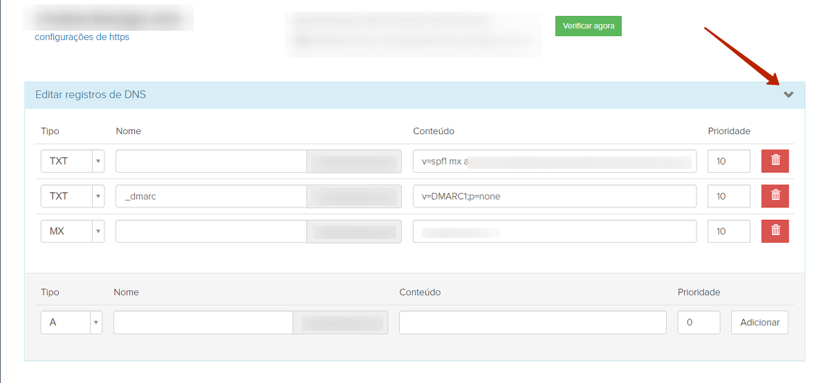 Para inserir os registros DNS, vá na aba “Domínios” nas configurações da sua conta, abra o domínio necessário e expanda o campo “Editar registros DNS”.