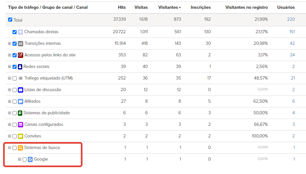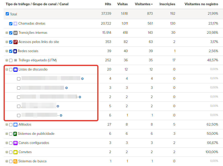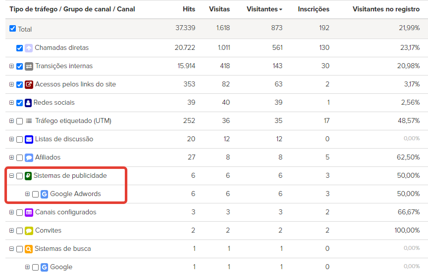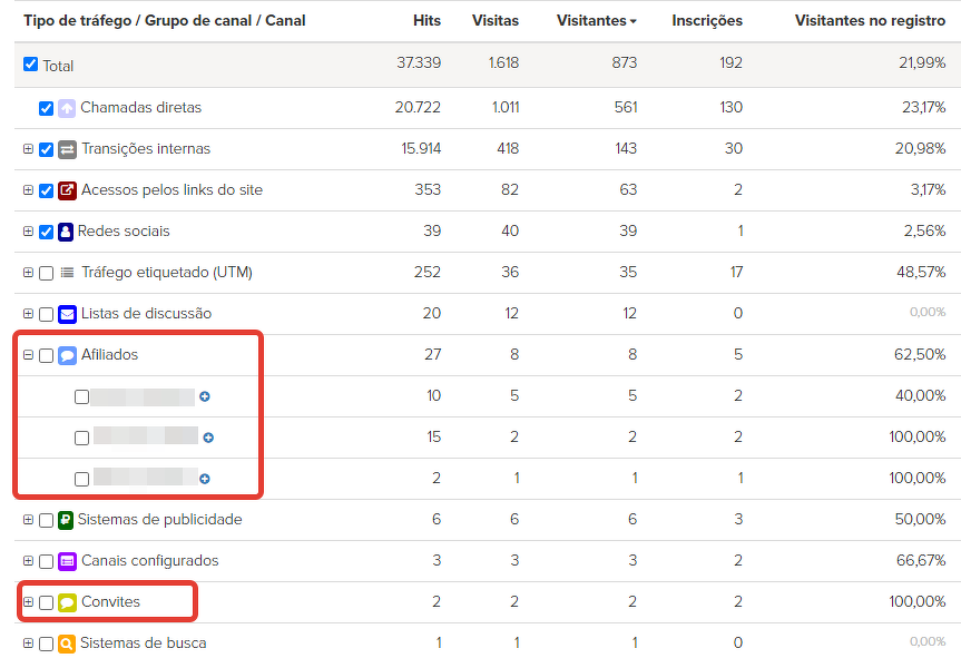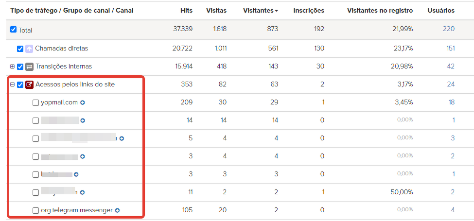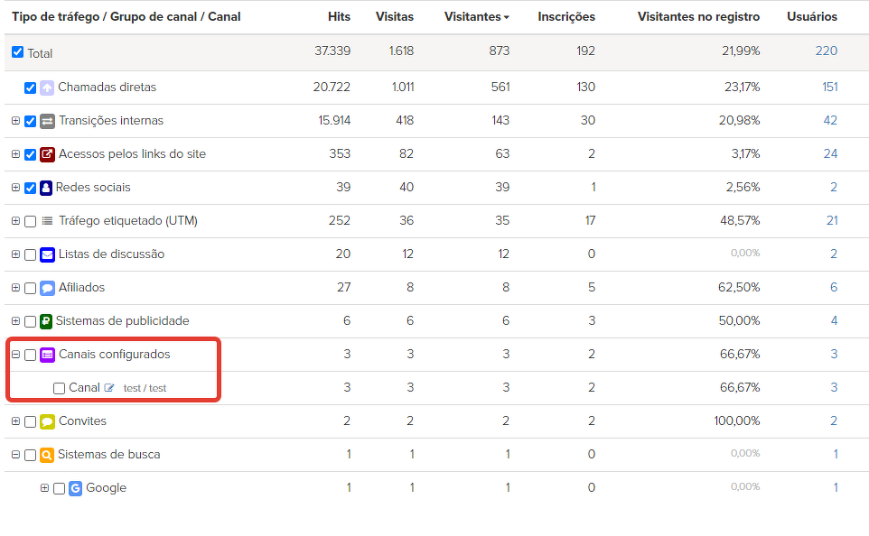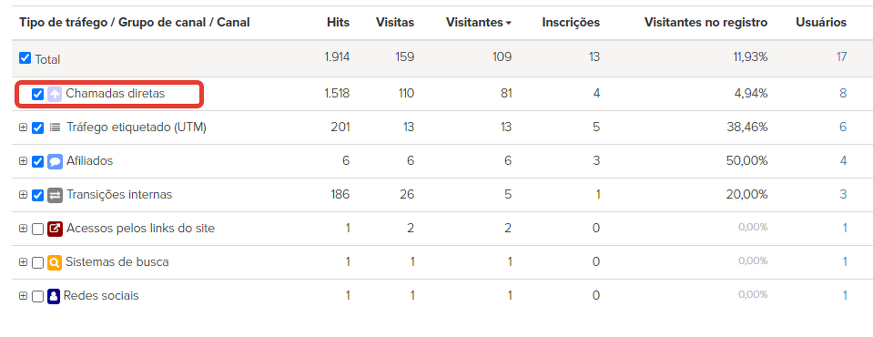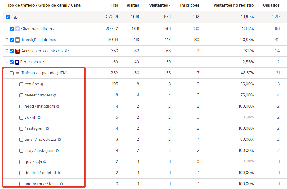 Chave de canal: é um parâmetro do sistema de tráfego marcado, que é inicialmente puxado automaticamente e distribuído entre tipos de tráfego prontos, como transições internas, mailings, parceiros e convites.