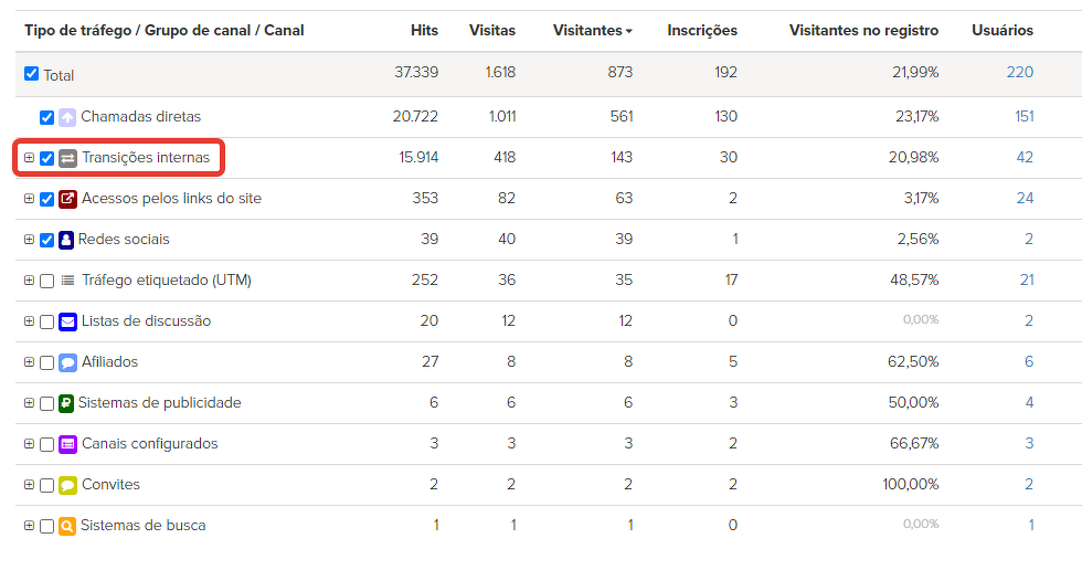 Canais personalizados: mostra as transições pelos canais que foram configurados na seção Tráfego – Canais.