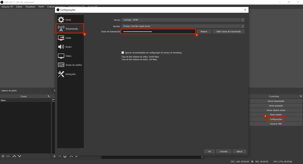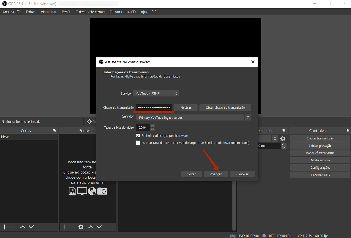 No próximo passo, insira a chave de transmissão nas configurações do OBS Studio: