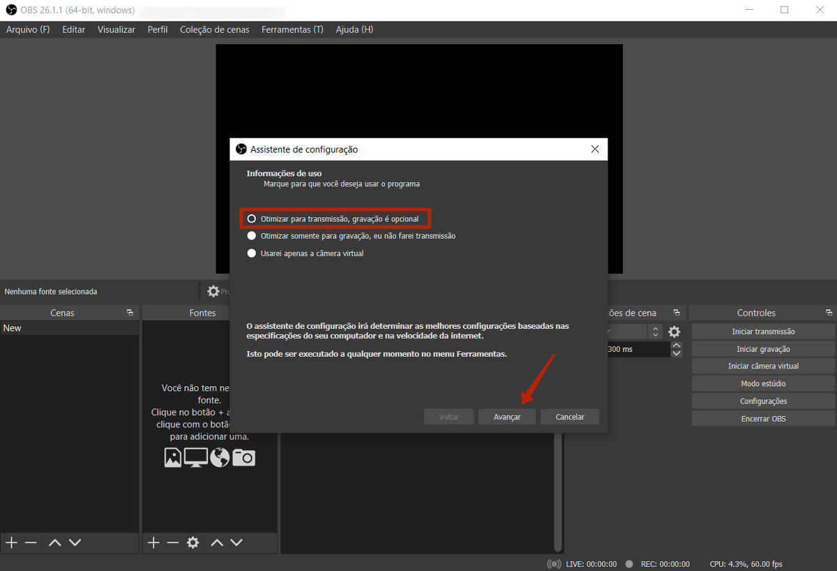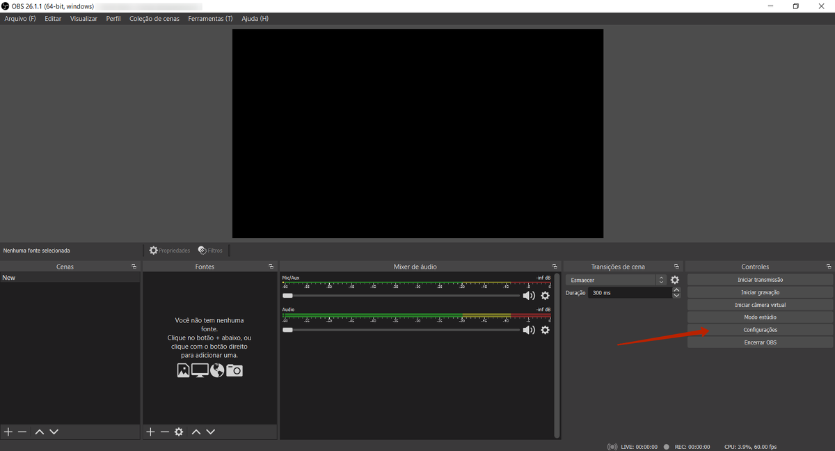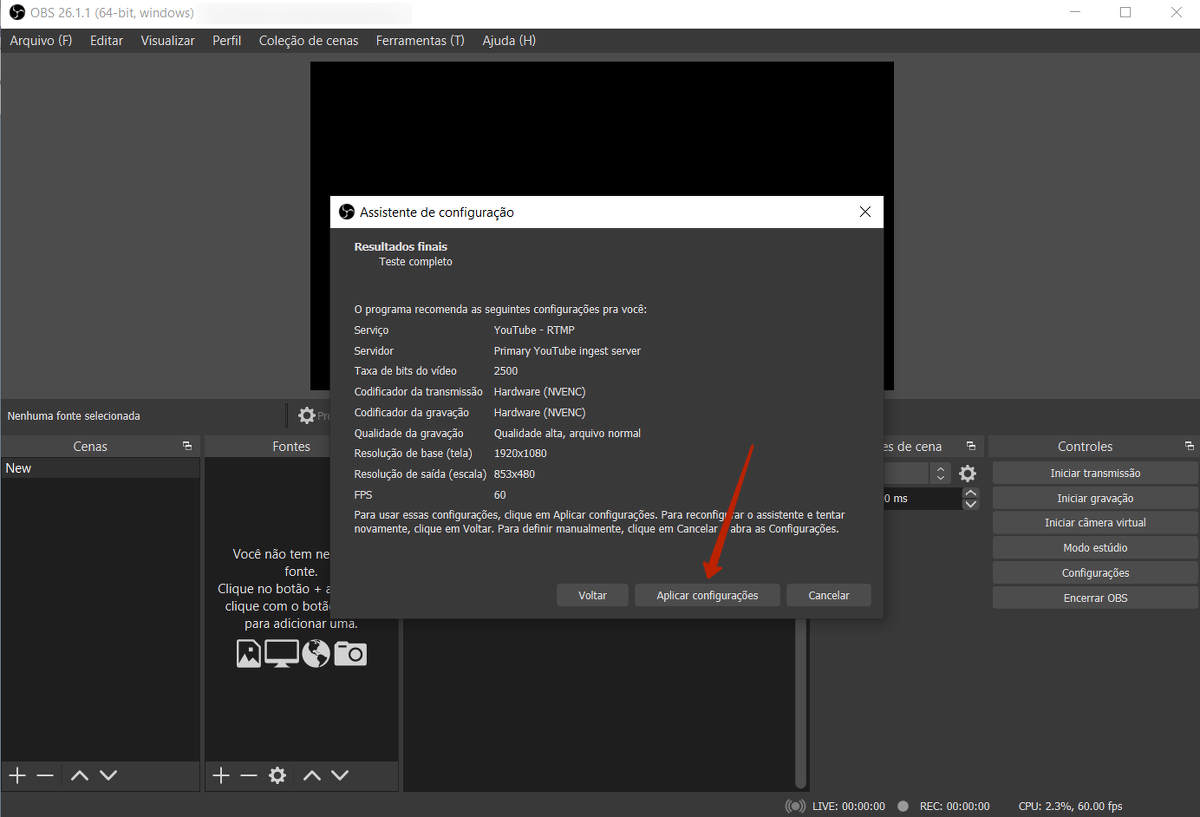 Após iniciar o programa, é necessário fazer as configurações de inicialização e conectar um serviço de streaming, como o YouTube.