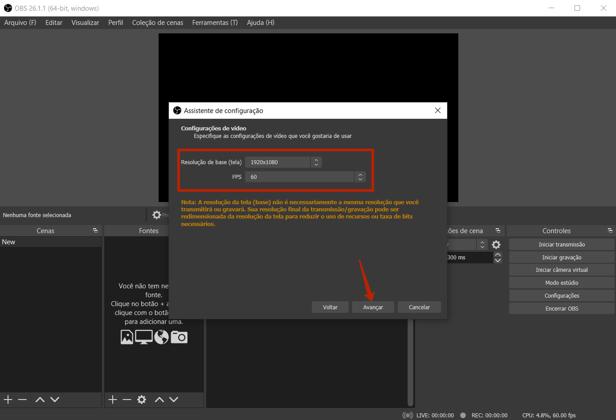Se seu PC não tiver muita potência, é recomendável diminuir a taxa de quadros para 30 FPS. A imagem ficará menos nítida, mas o tamanho do streaming de vídeo diminuirá, o que ajudará a evitar o congelamento do vídeo.