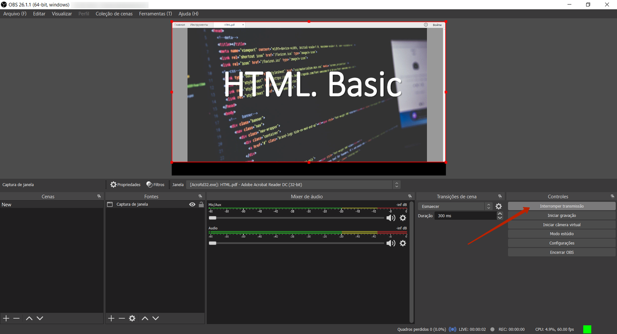 No OBS Studio, clique em “Interromper transmissão”.