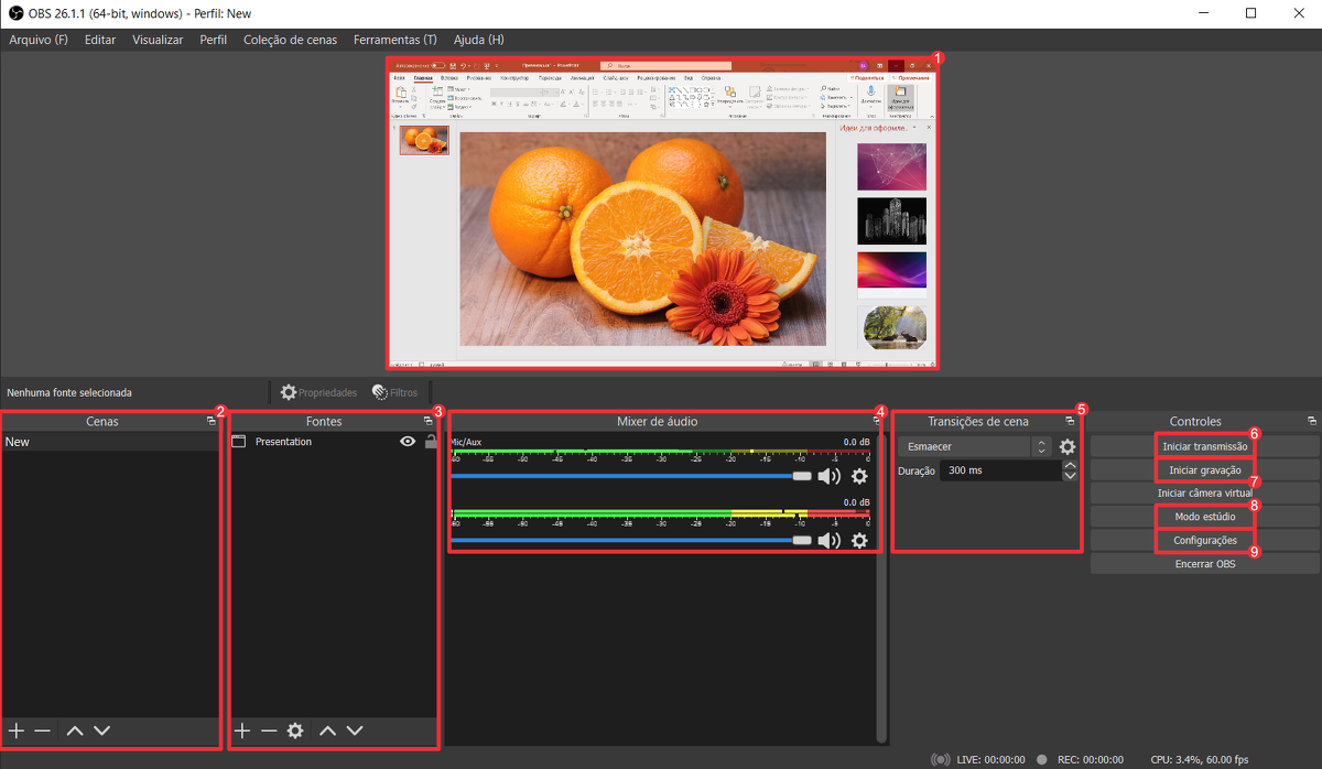 8. Modo estúdio: exibindo duas janelas com uma prévia da transmissão e a própria transmissão. Utilizado, por exemplo, quando é necessário adicionar uma fonte e ver como fica antes de ser colocada na transmissão.