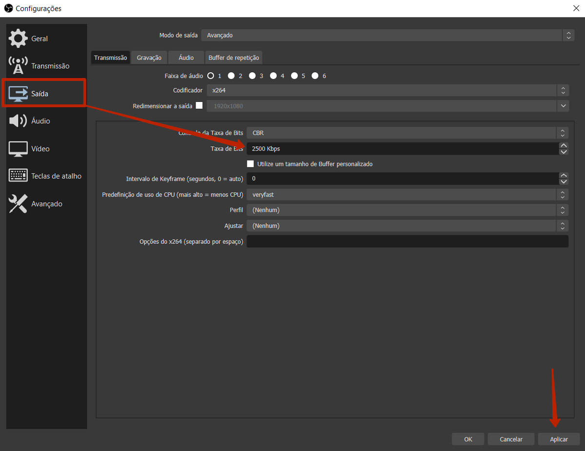 Nesta guia, você pode definir a taxa de bits para a transmissão do vídeo. A taxa de bits é a quantidade de informações que serão transmitidas por unidade de tempo. É esse parâmetro que mais afeta a qualidade da imagem. Reduzir a taxa de bits reduzirá a quantidade de recursos consumidos para transmissão (valores recomendados na faixa de 1.800 a 2.500 kbps).