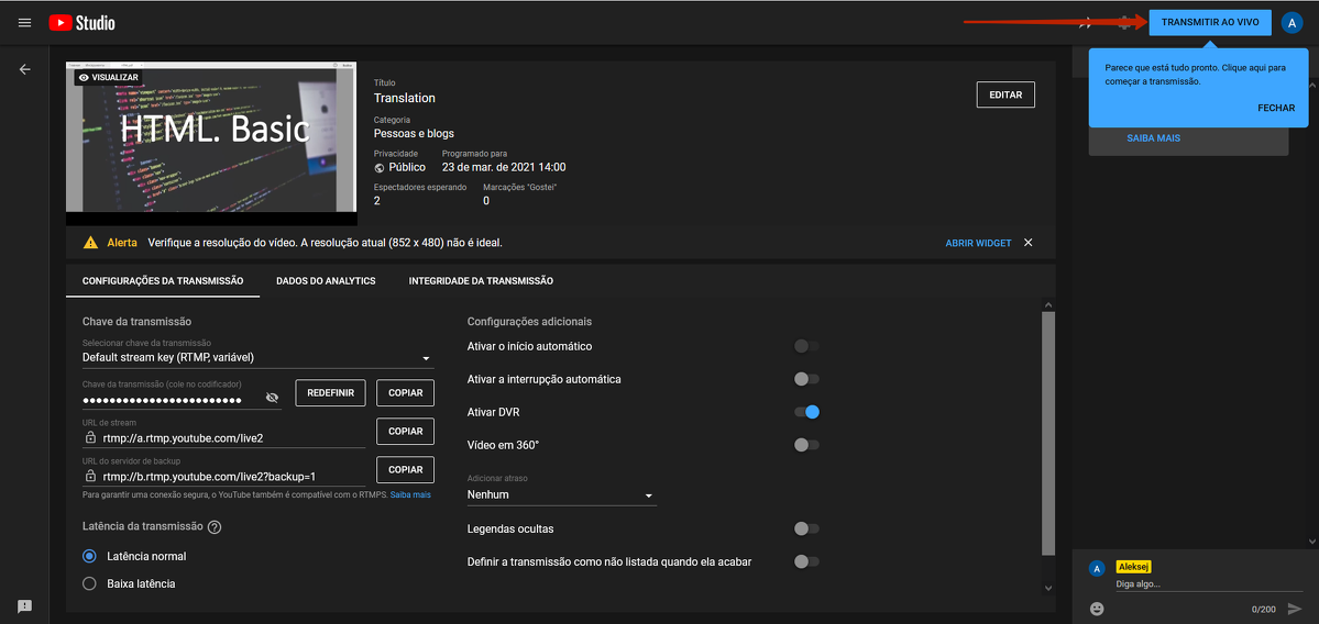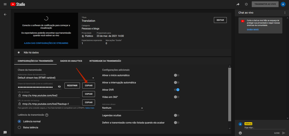 Primeiro é preciso criar uma transmissão programada em https://youtube.com/livestreaming/stream.