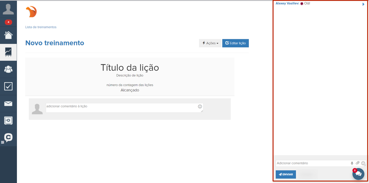É possível habilitar um chat nas aulas de treinamento onde os usuários poderão se comunicar.