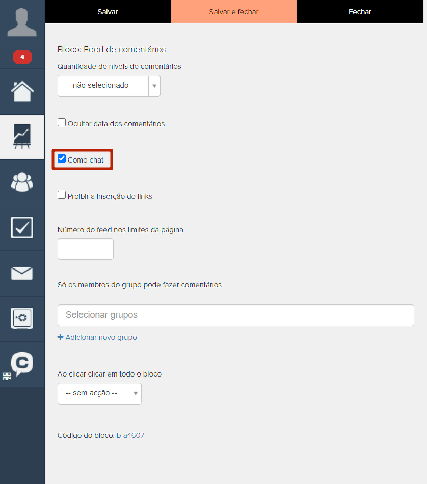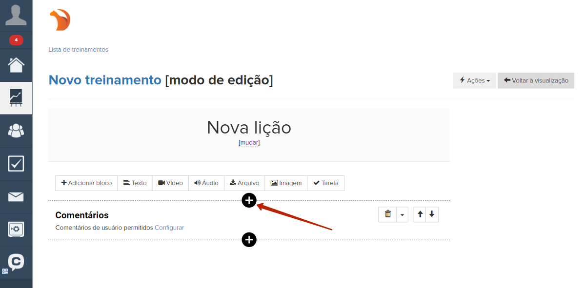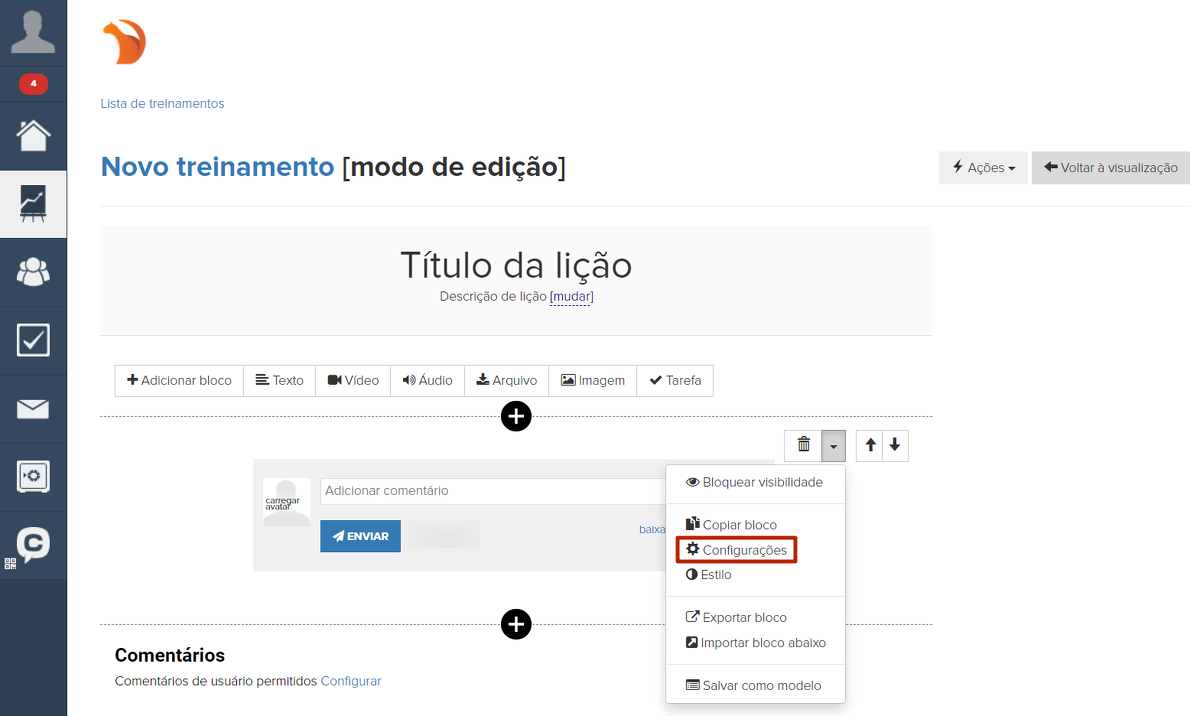 Nas aulas do tipo "Construtor visual", também é possível criar um chat separado para cada aula. Para isso, adicione o bloco "Feed de comentários".