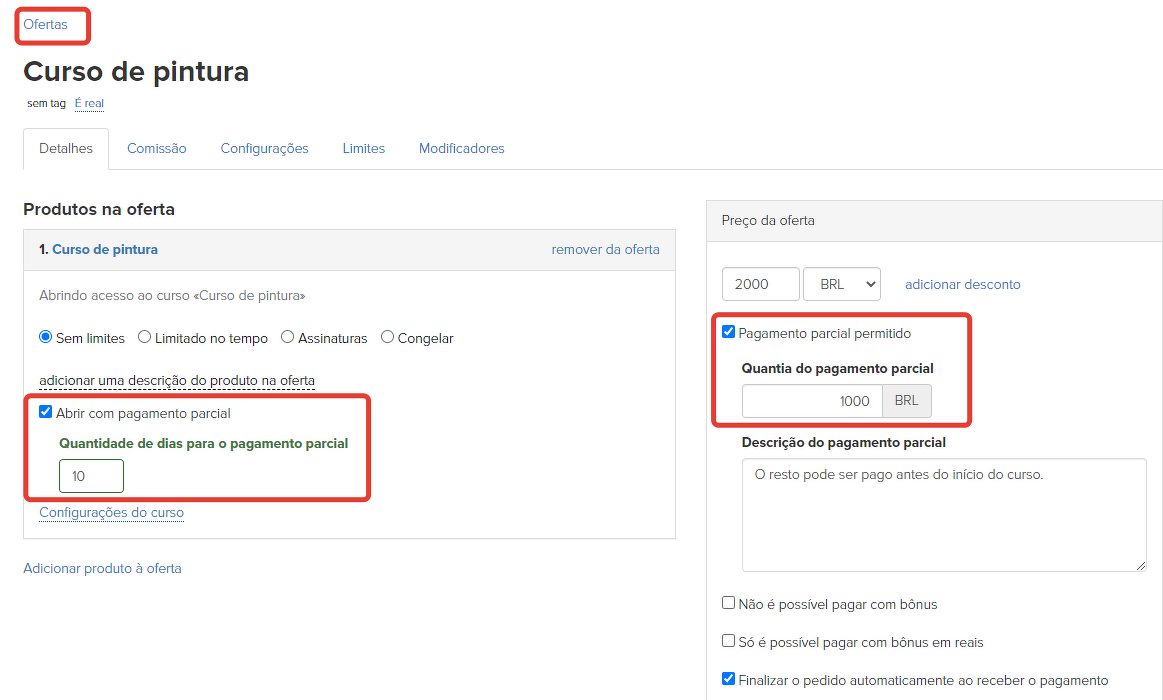 Para isso, na oferta do produto desejado, é necessário marcar a caixa "Abrir com pagamento parcial", e também indicar por quantos dias é preciso abrir o acesso.