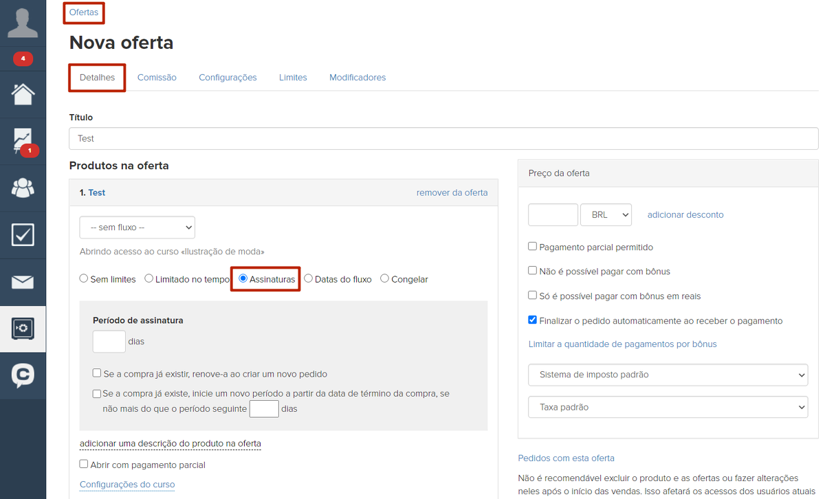 Para configurar uma assinatura (produtos/serviços de assinatura), é preciso colocar o seletor na posição "Assinatura" nas configurações da oferta.