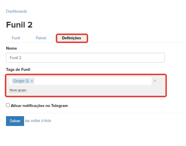 Na aba Configurações é possível adicionar uma tag na página do funil.