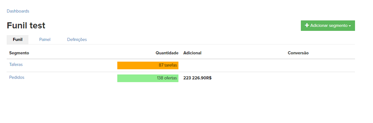 Os funis permitem que você visualize relatórios de vendas em um período específico - por segmento de usuários ou pedidos. Pode ser útil ver a conversão de registros em pedidos, configurando quantas etapas forem necessárias.