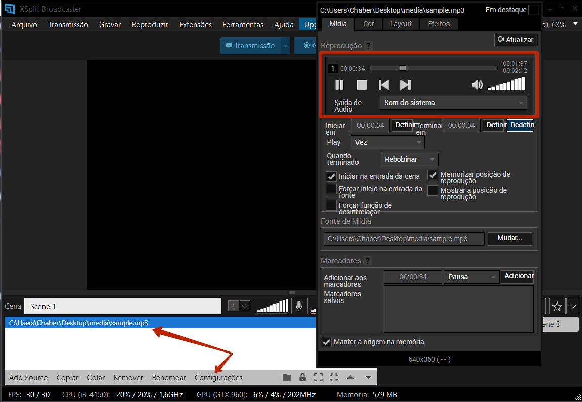 Para adicionar música de fundo, você deve clicar em "Adicionar Fonte" => "Arquivo de Mídia" e selecionar o arquivo de áudio. Dessa forma, você pode criar uma abertura de áudio antes do início do webinar.