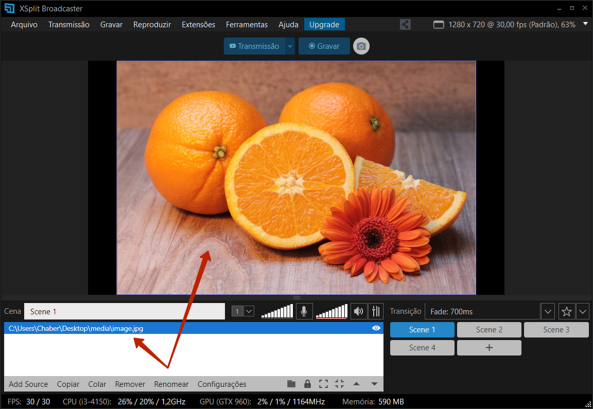 Para adicionar uma imagem ou vídeo, você deve clicar em "Adicionar fonte" => "Arquivo de mídia".