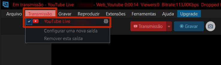 Para concluir a transmissão do Youtube, clique novamente no menu "Transmissão" => Seu canal.