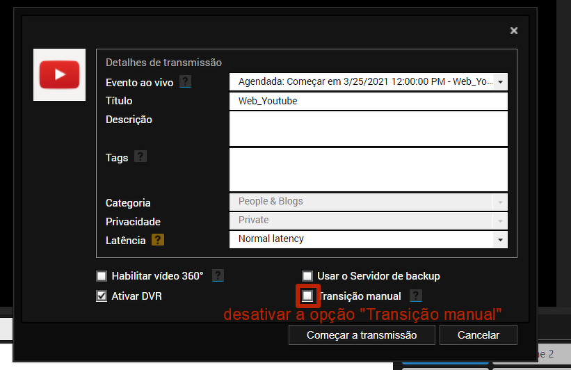 Se você deseja iniciar a transmissão ao vivo da transmissão programada, é necessário desativar a opção "Transição manual" para que a transmissão comece imediatamente sem confirmação no estúdio de criação https://youtube.com/livestreaming/stream